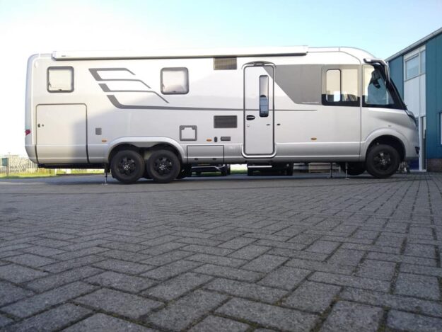 Deze mooie Hymer hebben we voorzien van een hydraulisch levelsysteem van het merk E&P Hydraulics. Hiermee kan deze camper met een druk op de knop waterpas worden gezet. Dat betekend vlak slapen en stabiel kamperen! Op de foto hierboven ziet u hoe de vier hydraulische steunpoten de complete camper van de grond heeft getild. Lees meer……